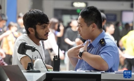 7月4日,北京西站工作人員為外籍旅客提供出行咨詢。