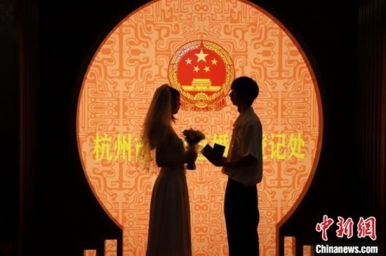 8月10日正值中國傳統(tǒng)節(jié)日七夕節(jié),超200對新人來到上城區(qū)婚姻登記服務(wù)中心領(lǐng)證。紅色的背景墻、金色的中式格柵、宋韻特色的剪影板,這些極具中式浪漫的設(shè)計見證了一對對新人的美好結(jié)合,也成為了熱門打卡點。