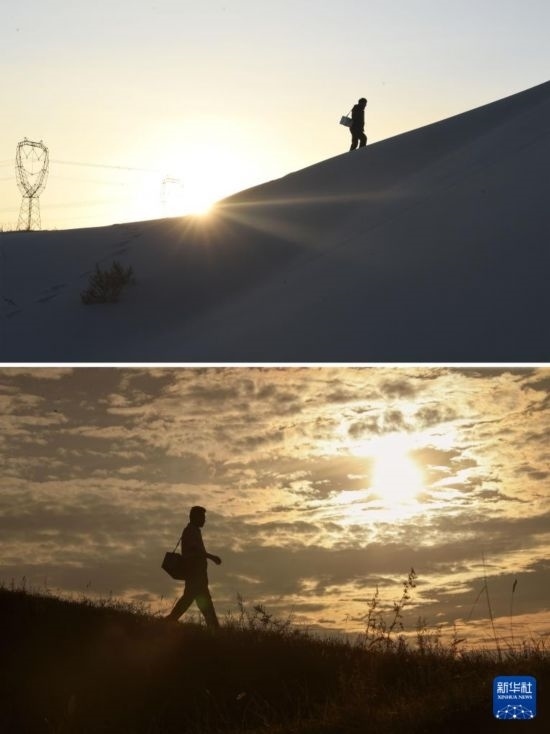 拼版照片:上圖為2018年1月25日,梁春榮出診時行走在“沙坨子”里;下圖為2024年8月13日,梁春榮在出診路上,曾經(jīng)翻越的“沙坨子”如今已是草地。