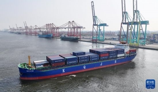 8月24日,“康琦嘉鴻”輪從天津港第二集裝箱碼頭離泊(無人機照片)。