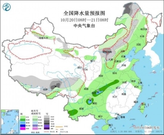 10月19日08時至20日08時,內蒙古西北部、新疆北疆北部和東部、西藏北部和東部、青海北部和南部、甘肅河西、川西高原北部等地部分地區(qū)有小雪或雨夾雪,其中,新疆北疆北部和北疆東部、西藏東部和南部等地部分地區(qū)有中到大雪(5~8毫米)。內蒙古西部、西北地區(qū)東北部、湖南南部、西南地區(qū)東部、廣西西南部等地部分地區(qū)有中到大雨,其中,四川盆地西北部、重慶中西部等地部分地區(qū)有暴雨(50~80毫米)。浙江北部部分地區(qū)有4~6級風,其中,黑龍江東北部、西藏北部等地部分地區(qū)有6~7級風。