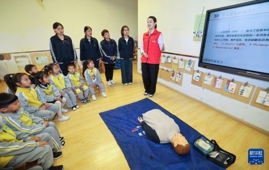 10月22日,國(guó)網(wǎng)浙江湖州供電公司“救”在身邊志愿服務(wù)隊(duì)的黨員志愿者梅月圓(右一)在長(zhǎng)興縣開發(fā)區(qū)中心幼兒園開展應(yīng)急救護(hù)培訓(xùn)和急救知識(shí)普及。紅十字二級(jí)應(yīng)急救護(hù)師梅月圓是應(yīng)急救護(hù)培訓(xùn)志愿者,也是浙江省三八紅旗手。