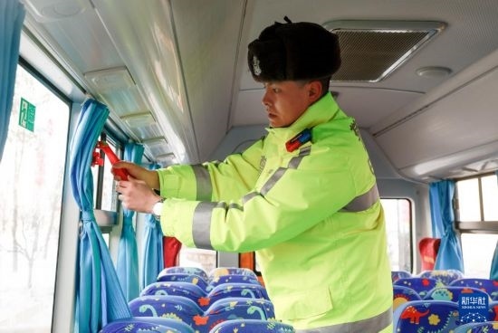 2月14日,烏魯木齊市公安局交警支隊水磨溝區(qū)大隊民警檢查校車安全錘。