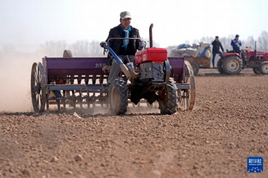 2月26日,在銀川市賀蘭縣立崗鎮(zhèn)通伏村,農(nóng)戶在田間播種小麥。