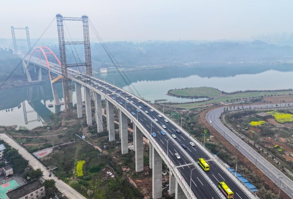 3月20日,車輛行駛在重慶潼南東升大橋上(無人機(jī)照片)。新華社記者 王全超 攝