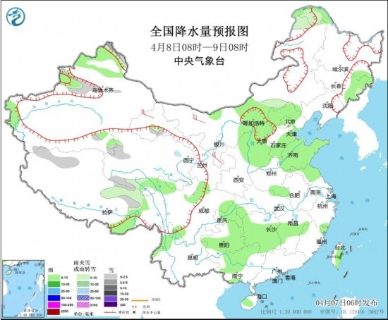 4月8日08時(shí)至9日08時(shí),新疆北部、內(nèi)蒙古中東部、西藏北部、青海南部等地有小到中雪或雨夾雪,內(nèi)蒙古中部、陜西北部、山西、河北北部和南部、山東、貴州東部和南部、湖南中南部、江西中部、廣西中北部、海南島、臺(tái)灣島等地有小到中雨。內(nèi)蒙古大部、甘肅河西、陜西中北部、山西等地部分地區(qū)有4~6級(jí)風(fēng),陣風(fēng)7級(jí)。