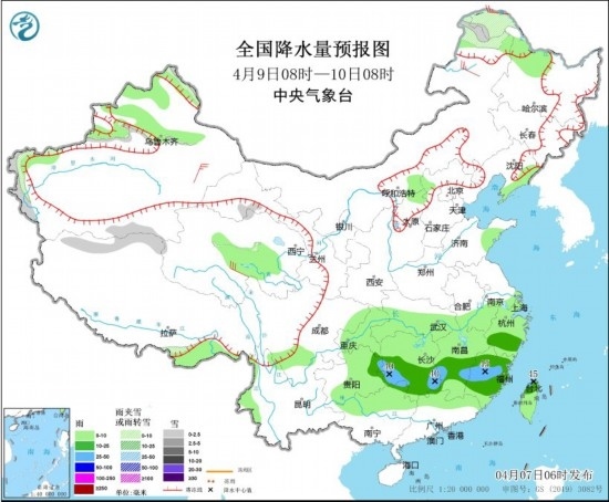 4月9日08時(shí)至10日08時(shí),內(nèi)蒙古東部、新疆南疆西部山區(qū)有小到中雪或雨夾雪,貴州東部、湖南中南部、江西中南部、浙江南部、福建、臺(tái)灣島中北部等地有中到大雨(25~45毫米)。內(nèi)蒙古中部和東部、陜西中北部、山西部分地區(qū)有4~6級(jí)風(fēng),陣風(fēng)7級(jí)。