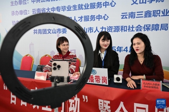 4月9日,工作人員在云南省文山學院招聘會現(xiàn)場進行“直播帶崗”。