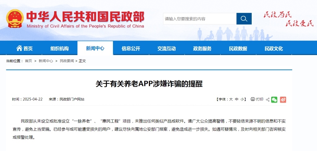 4月22日,民政部發(fā)布公告表示,民政部從未設(shè)立或批準(zhǔn)設(shè)立“一脈養(yǎng)老”“惠民工程”項(xiàng)目,未推出任何類似產(chǎn)品或軟件。請(qǐng)廣大公眾提高警惕,不要輕信來源不明的信息和不實(shí)宣傳,避免上當(dāng)受騙。已經(jīng)參與或可能遭受損失的用戶,建議盡快向?qū)俚毓膊块T報(bào)案,避免造成進(jìn)一步損失。如遇可疑情況,及時(shí)向相關(guān)部門咨詢核實(shí)或報(bào)警處理。(記者朱高祥)