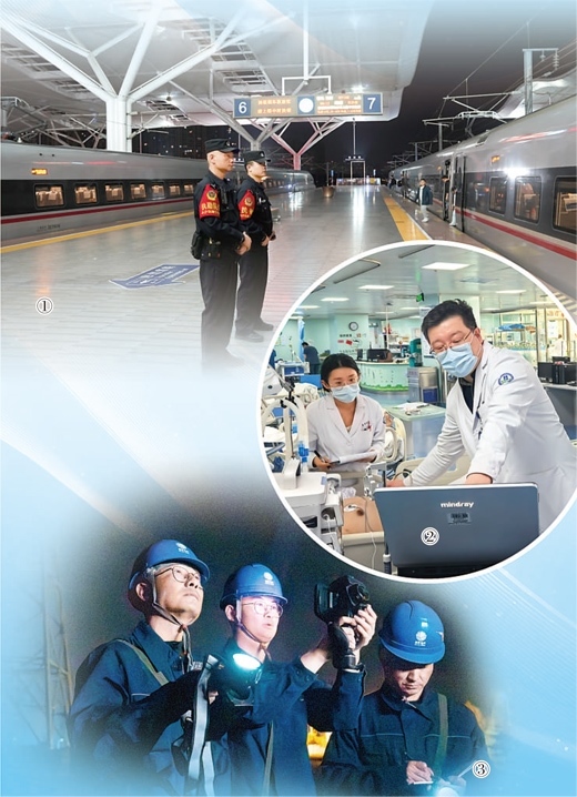 圖①:凌晨的長(zhǎng)沙南站,鐘亞(左)和同事在執(zhí)勤。