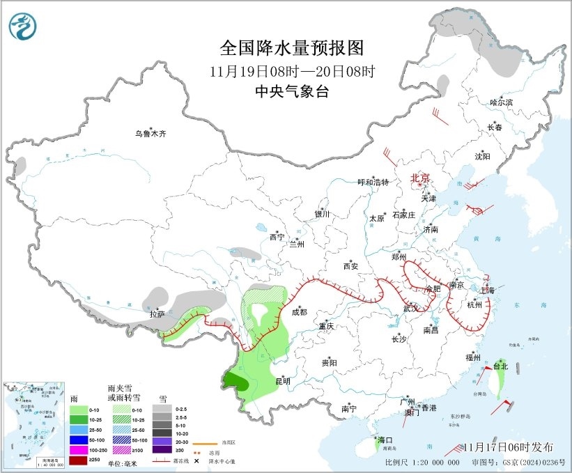 11月17日08時至18日08時,內(nèi)蒙古東北部、黑龍江東部、吉林東部、河南西南部、陜西東南部、湖北西北部等地部分地區(qū)有小到中雪或雨夾雪,其中,陜西東南部、湖北西北部等地局地有大雪(5~9毫米);江淮西部、江漢、江南北部和西部、西南地區(qū)東部和南部、華南北部和西部等地部分地區(qū)有小到中雨。新疆北部、甘肅北部、青海東部和南部、內(nèi)蒙古中東部、黑龍江東部、華北北部、遼東半島、山東半島、江漢東部、湖南北部、江西北部、浙閩東部沿海等地的部分地區(qū)有5~6級風、陣風7~9級;渤海、渤海海峽有7級風、陣風8級,黃海大部、東海大部、臺灣海峽、臺灣以東洋面、南海北部和中部、北部灣有7~8級風、陣風9~10級,其中,東海南部、臺灣海峽的部分海域風力可達9級、陣風10~11級。