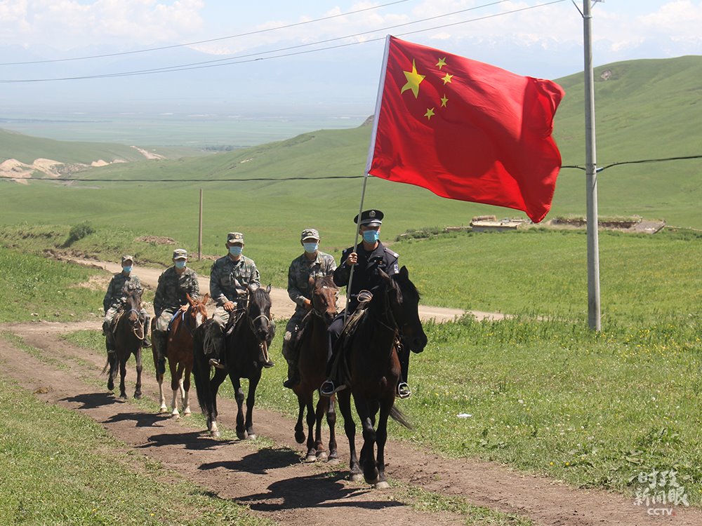 △新疆伊犁昭蘇縣洪土溝邊境檢查站民警和護(hù)邊員在邊境線(xiàn)踏查。