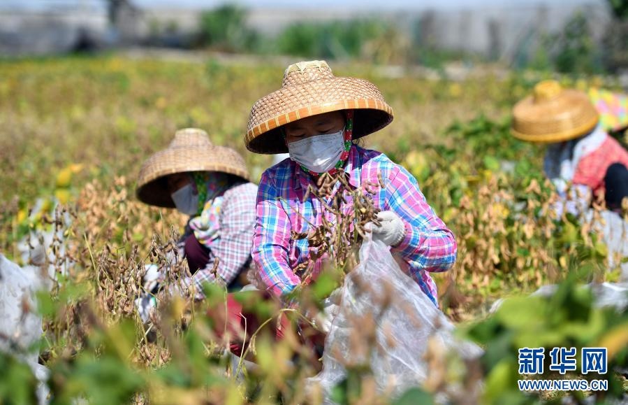工人在采收中國農(nóng)業(yè)科學院油料作物研究所在三亞繁育的大豆(2020年2月27日)。新華社記者 郭程 攝