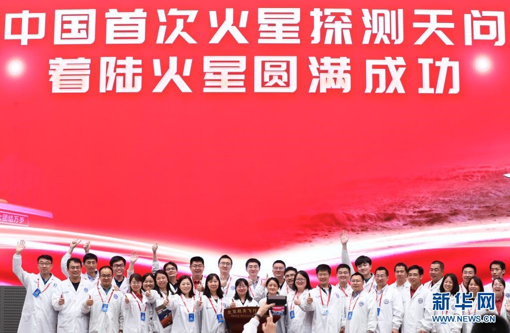 2021年5月15日,航天科研人員在北京航天飛行控制中心指揮大廳慶祝我國(guó)首次火星探測(cè)任務(wù)著陸火星成功。新華社記者 金立旺 攝