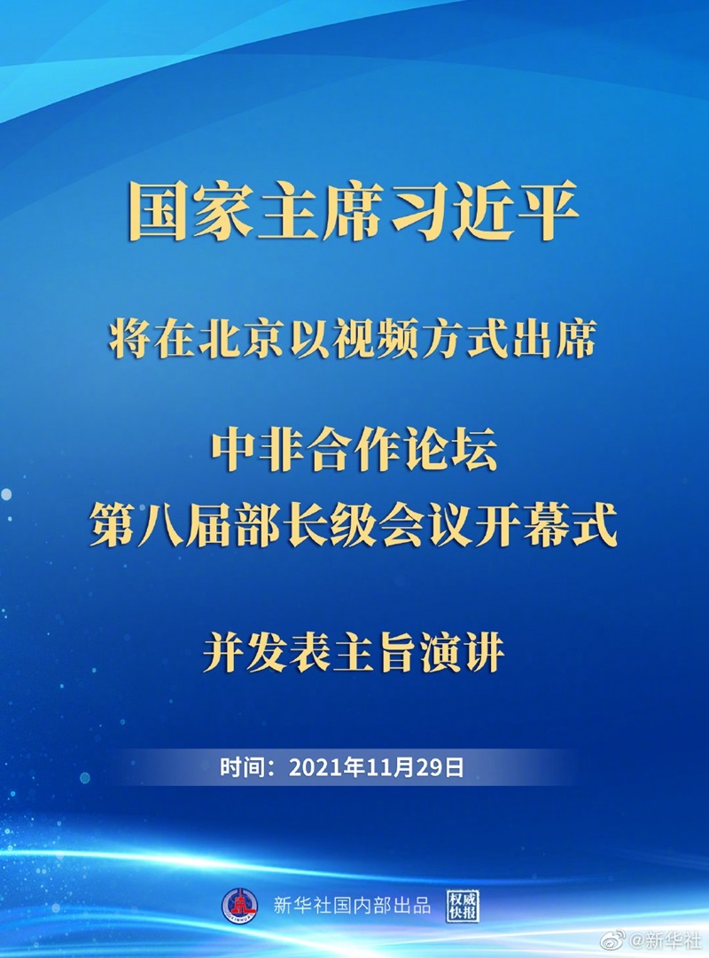 新華社北京11月26日電 外交部發(fā)言人華春瑩26日宣布:國(guó)家主席習(xí)近平將于11月29日在北京以視頻方式出席中非合作論壇第八屆部長(zhǎng)級(jí)會(huì)議開幕式并發(fā)表主旨演講。