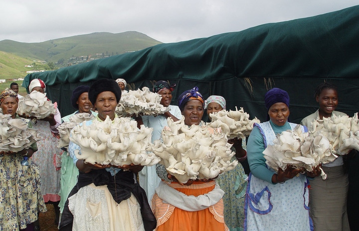 圖為2006年4月,南非一家菌草合作社的群眾展示收獲的菌草平菇。新華社發(fā)(國家菌草工程技術(shù)研究中心供圖)