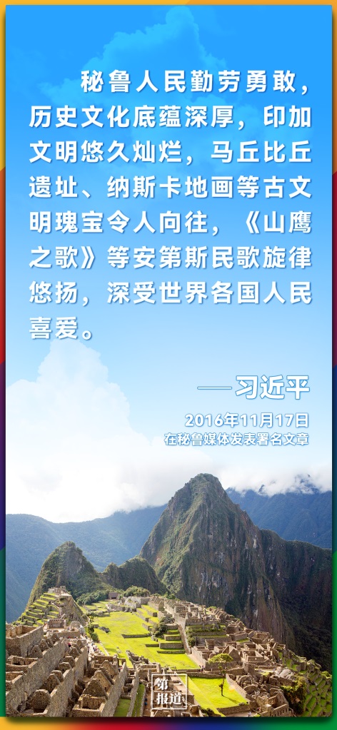 2016年對(duì)秘魯進(jìn)行國事訪問期間,習(xí)近平主席在時(shí)任秘魯總統(tǒng)庫琴斯基的陪同下,出席了中拉文化交流年閉幕式。途中參觀《文明的長河——中拉文明互鑒》圖片展時(shí),共同欣賞了中秘兩國樂隊(duì)一起演奏的中國民歌《沂蒙山歌》和秘魯民歌《山鷹之歌》。