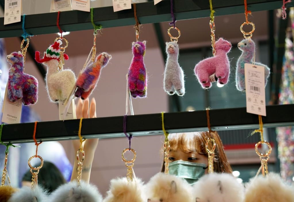2021年11月7日,第四屆中國國際進(jìn)口博覽會(huì)上,用秘魯羊駝毛制作的掛件廣受歡迎。