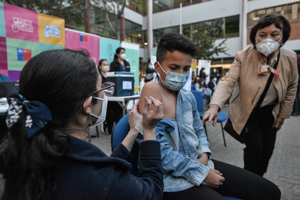 2021年9月27日,一名兒童在智利首都圣地亞哥接種科興新冠疫苗。27日起,智利開始對(duì)6歲至11歲在校學(xué)生接種中國科興疫苗。