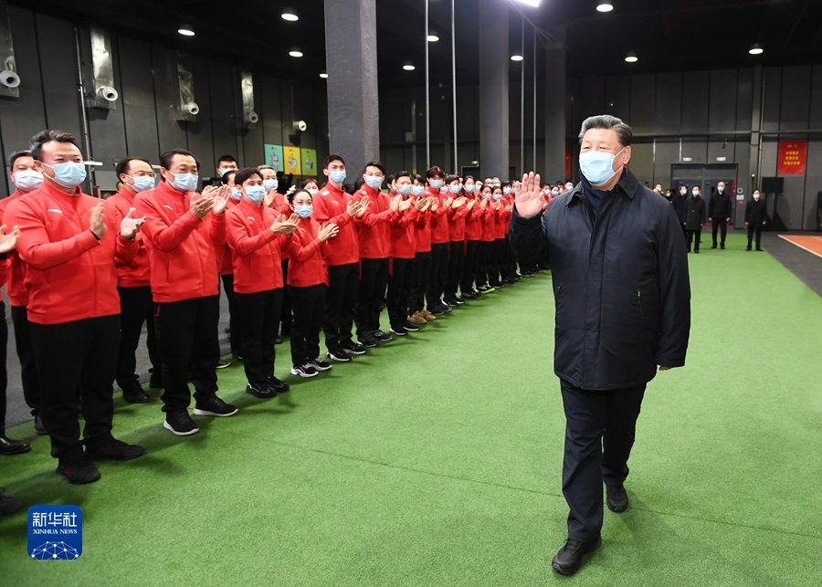 1月4日,中共中央總書記、國家主席、中央軍委主席習(xí)近平在北京考察2022年冬奧會、冬殘奧會籌辦備賽工作。這是4日下午,習(xí)近平在二七廠冰雪項目訓(xùn)練基地專項體能訓(xùn)練館,向運動員、教練員、服務(wù)保障人員揮手致意。新華社記者 謝環(huán)馳 攝