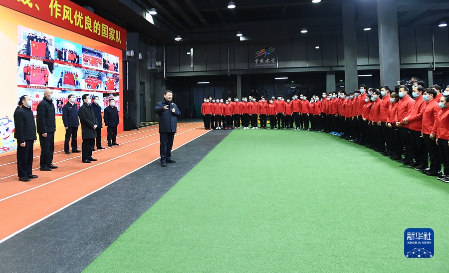 1月4日,中共中央總書記、國家主席、中央軍委主席習近平在北京考察2022年冬奧會、冬殘奧會籌辦備賽工作。這是4日下午,習近平在二七廠冰雪項目訓練基地速滑館,向參訓運動員、教練員表示慰問。新華社記者 謝環(huán)馳 攝