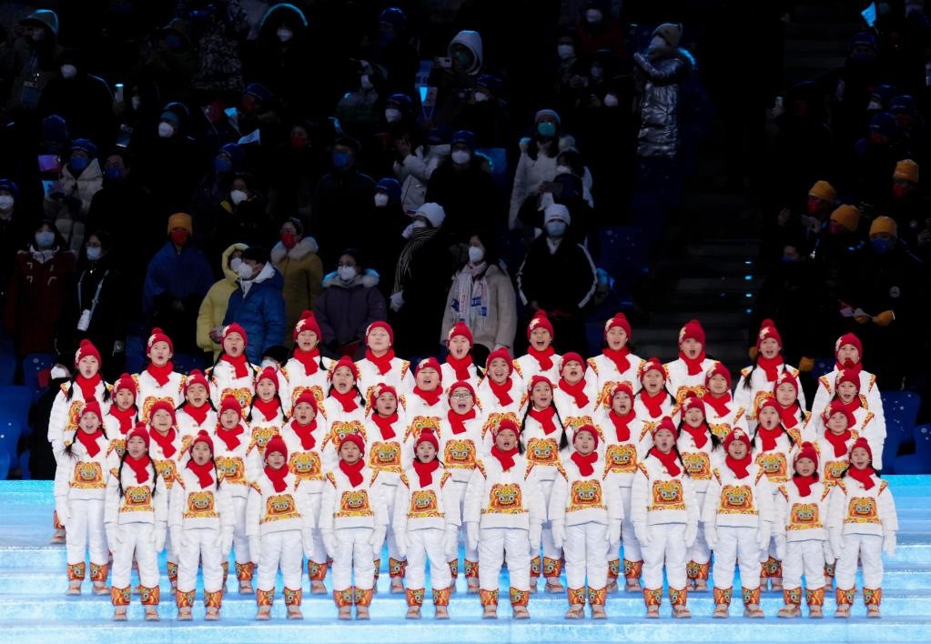 2月4日晚,第二十四屆冬季奧林匹克運動會開幕式在北京國家體育場舉行。圖為孩子們演唱奧林匹克會歌。新華社記者李安攝