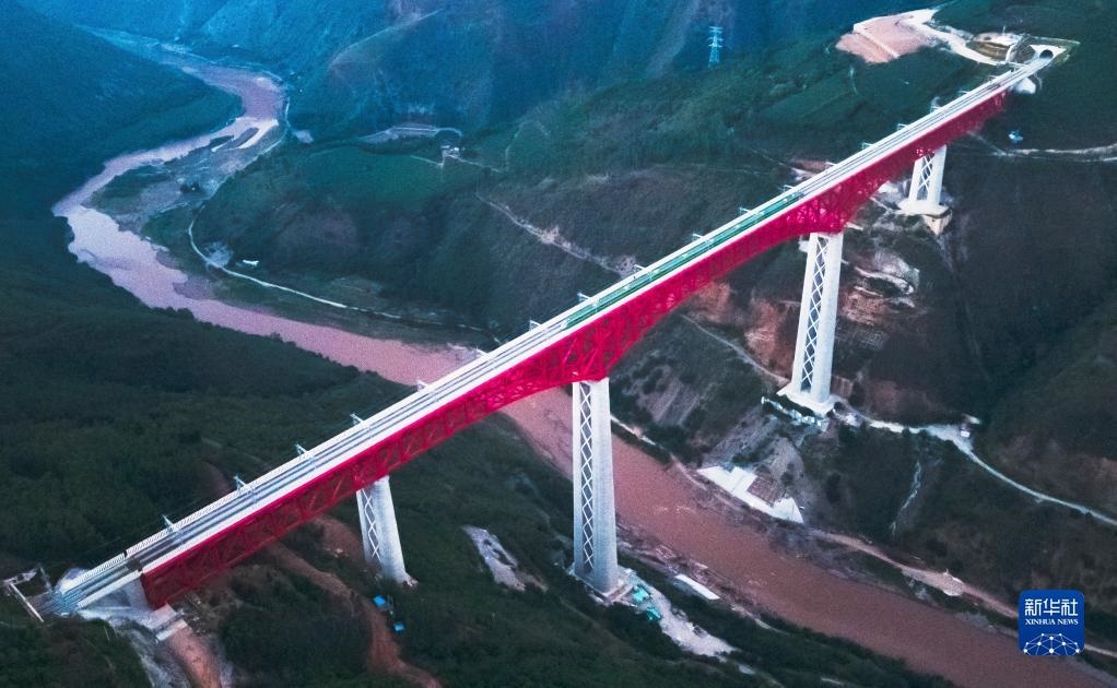 中老鐵路首發(fā)列車駛過中國(guó)云南省元江哈尼族彝族傣族自治縣境內(nèi)的元江雙線特大橋(2021年12月3日攝,無人機(jī)照片)。新華社記者 王冠森 攝