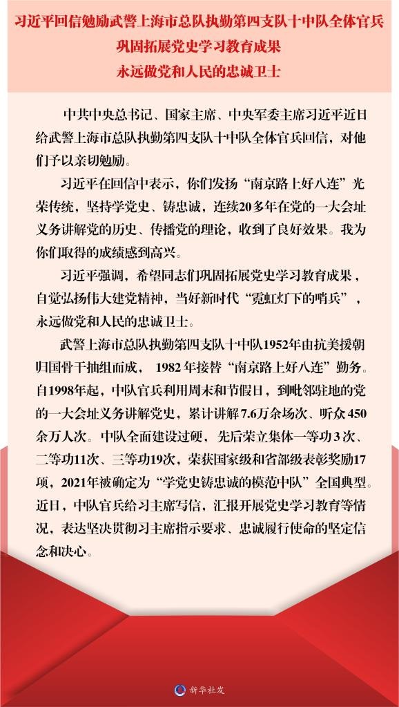 武警上海市總隊執(zhí)勤第四支隊十中隊1952年由抗美援朝歸國骨干抽組而成,1982年接替“南京路上好八連”勤務。自1998年起,中隊官兵利用周末和節(jié)假日,到毗鄰駐地的黨的一大會址義務講解黨史,累計講解7.6萬余場次、聽眾450余萬人次。中隊全面建設過硬,先后榮立集體一等功3次、二等功11次、三等功19次,榮獲國家級和省部級表彰獎勵17項,2021年被確定為“學黨史鑄忠誠的模范中隊”全國典型。近日,中隊官兵給習主席寫信,匯報開展黨史學習教育等情況,表達堅決貫徹習主席指示要求、忠誠履行使命的堅定信念和決心。