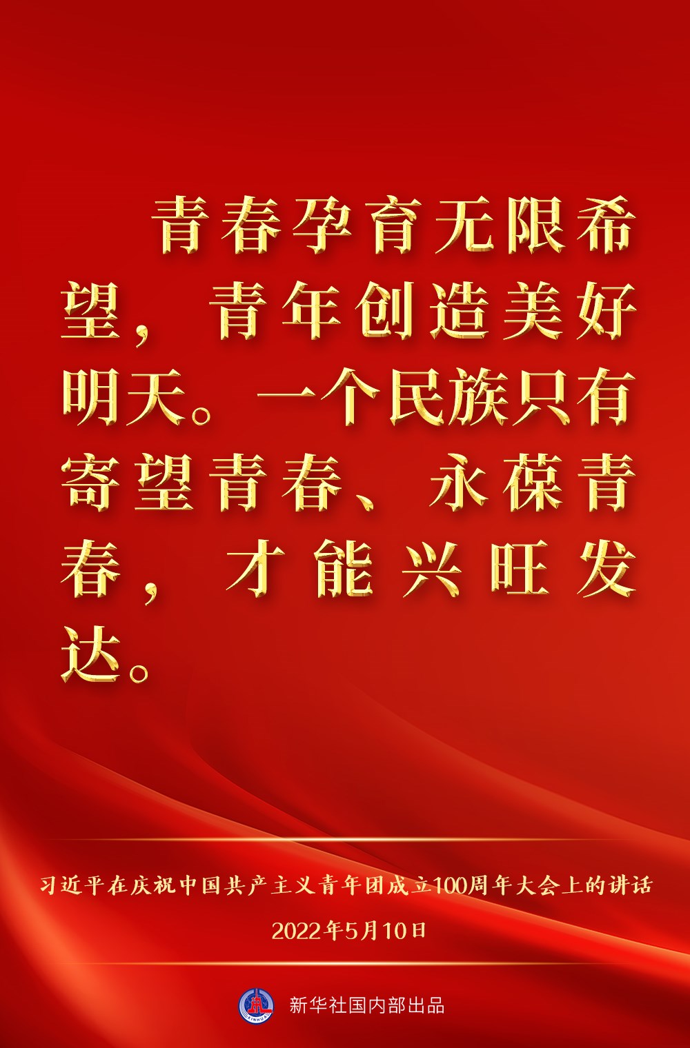 5月10日上午,中共中央總書記、國家主席、中央軍委主席習(xí)近平出席慶祝中國共產(chǎn)主義青年團(tuán)成立100周年大會并發(fā)表重要講話,一起來看金句。