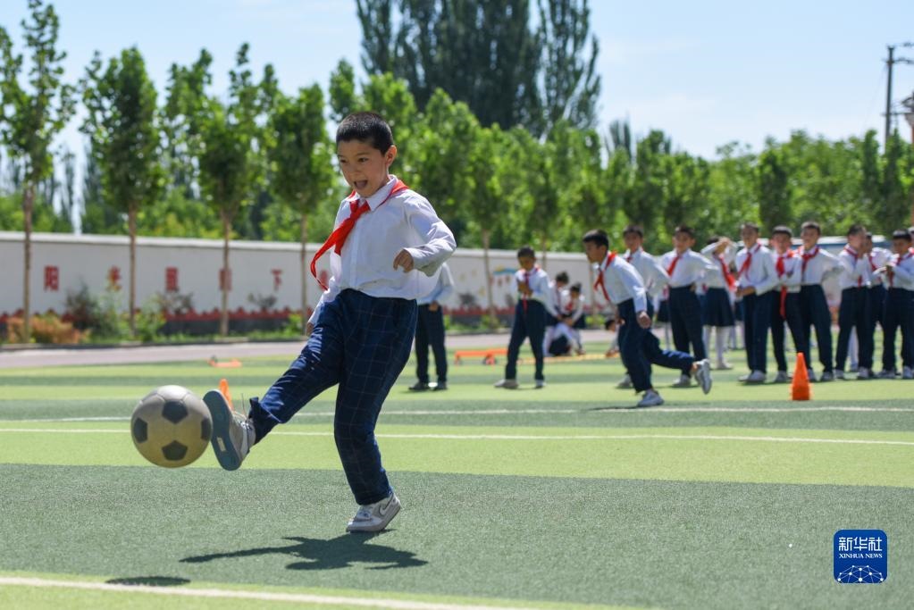 在新疆喀什地區(qū)疏附縣托克扎克鎮(zhèn)中心小學(xué),學(xué)生們在上體育課(2022年6月10日攝)。新華社記者 丁磊 攝