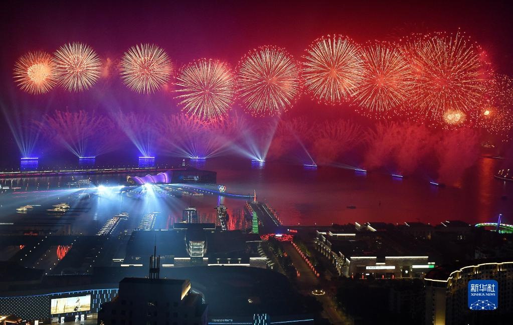 這是在青島舉行的《有朋自遠方來》燈光焰火藝術表演(2018年6月9日晚攝)。2018年6月9日至10日,上海合作組織成員國元首理事會第十八次會議在青島召開。新華社記者李紫恒攝