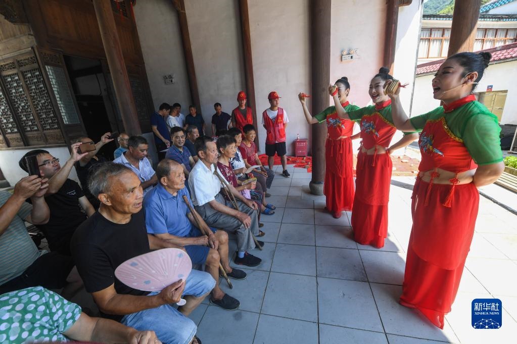 浙江省杭州市臨安區(qū)高虹鎮(zhèn)廉政文藝宣傳隊(duì)在石門(mén)村表演快板小段《清廉高虹》(2021年9月1日攝)。新華社記者 徐昱 攝