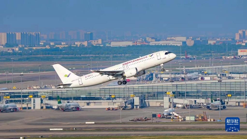 2022年5月14日6時(shí)52分,編號(hào)為B-001J的C919大飛機(jī)從上海浦東機(jī)場(chǎng)第4跑道起飛,于9時(shí)54分安全降落,標(biāo)志著中國商飛公司即將交付首家用戶的首架C919大飛機(jī)首次飛行試驗(yàn)圓滿完成。新華社發(fā)