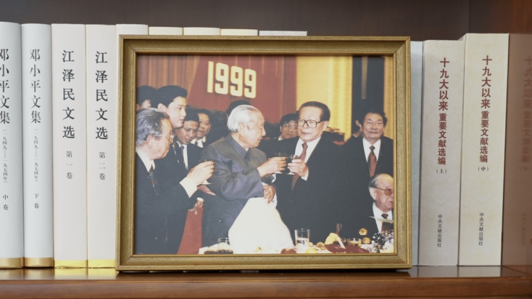 書架上擺放著一張合影。這是1999年9月30日,江澤民同志、朱镕基同志、習(xí)仲勛同志在慶祝建國(guó)五十周年招待會(huì)上。這張照片第一次出現(xiàn)在習(xí)近平總書記的書架上。