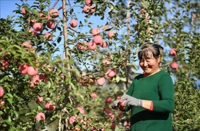 2022年10月,在陜西延安南溝村果園,習(xí)近平總書記同老鄉(xiāng)們親切交流,并采摘了一個紅紅的大蘋果。