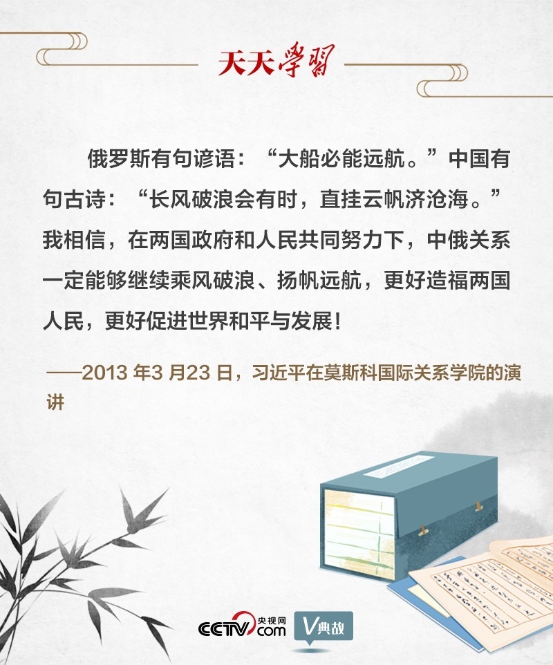 關于中俄關系,早在10年前在莫斯科國際關系學院的演講中,習近平主席就有精辟闡述。演講結束語中,習主席首先引用一句俄羅斯諺語“大船必能遠航”,拉近了與俄羅斯民眾的文化空間和心理距離。接著引用了含義相近的中國古詩“長風破浪會有時,直掛云帆濟滄?!保寣Ψ皆谖幕嗨菩灾猩羁填I悟其中道理。最后凝聚共同理念:“中俄關系一定能夠繼續(xù)乘風破浪、揚帆遠航”。