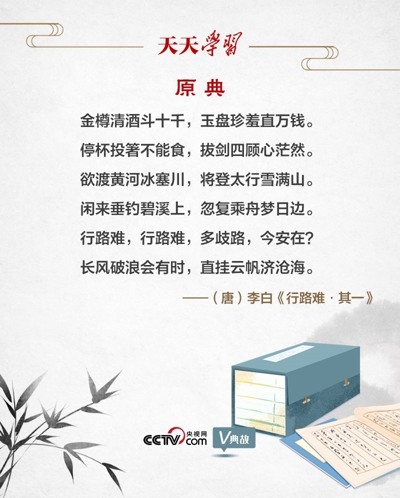 “行路難”為樂府古題,多詠嘆世路艱難及貧困孤苦的處境。李白的《行路難》共三首,“長風破浪會有時”出自第一首。唐天寶元年(742年),李白奉詔入京,擔任翰林供奉。后因權臣讒毀排擠,被“賜金放還”?!缎新冯y》便是李白離開長安時所作。