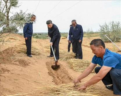 △2019年8月21日,正在甘肅考察的習(xí)近平總書記來到古浪縣八步沙林場(chǎng)。考察中,他拿起一把開溝犁,參與到治沙勞動(dòng)中。