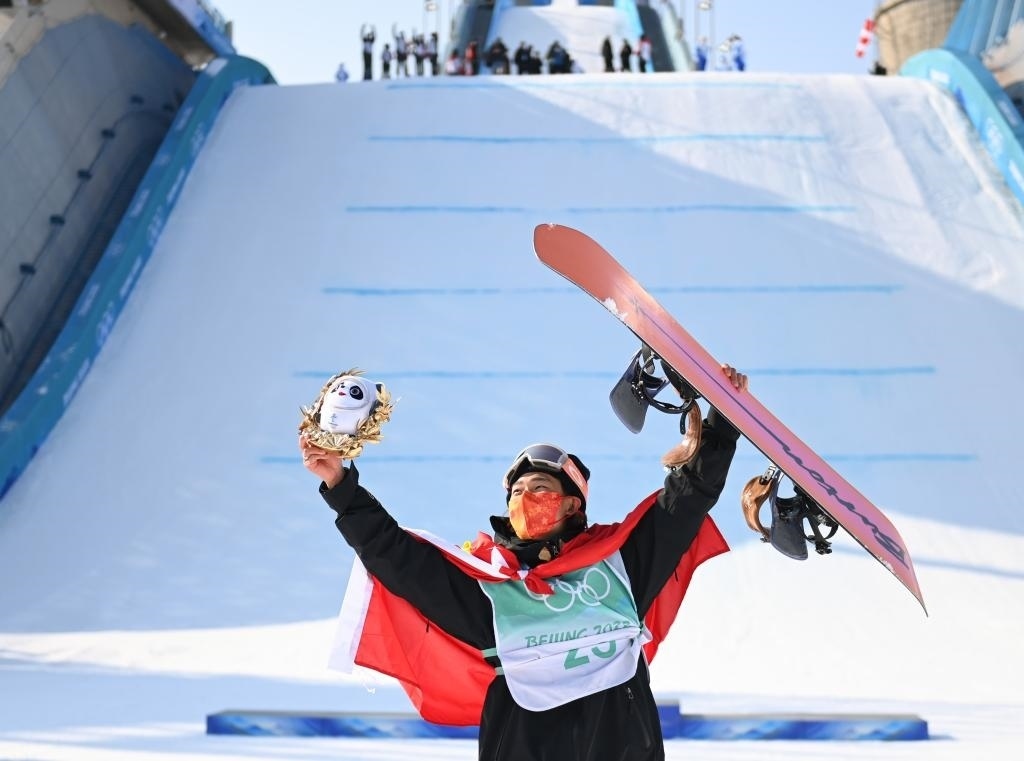 這是2022年2月15日,中國選手蘇翊鳴在北京2022年冬奧會(huì)單板滑雪男子大跳臺(tái)決賽奪冠后慶祝。新華社記者 黃宗治 攝