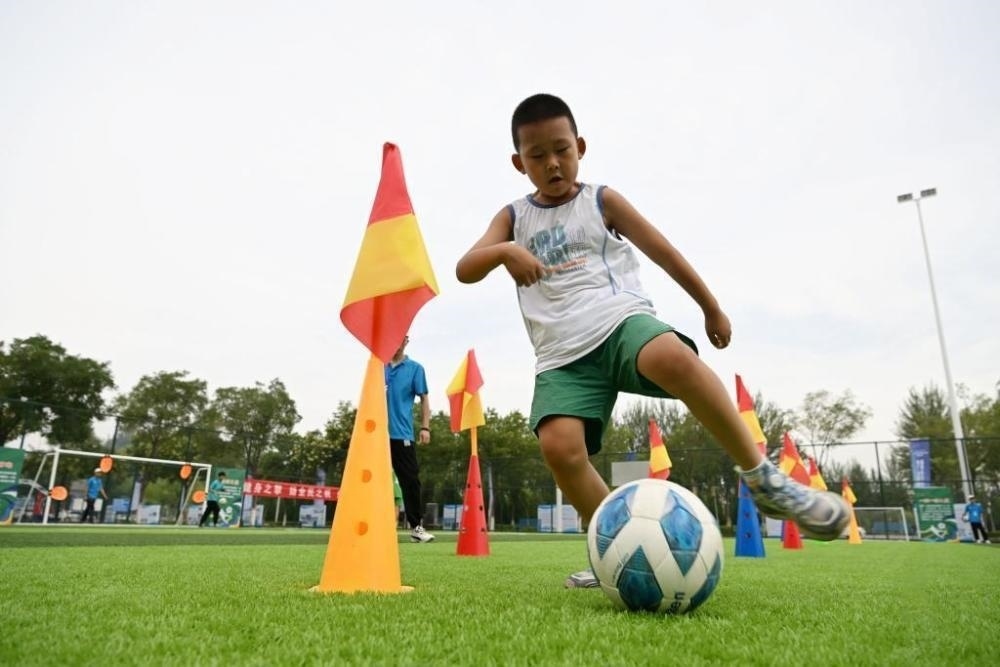△2023年8月6日,一位小朋友在寧夏全民健身日主題示范系列活動現(xiàn)場體驗趣味足球。