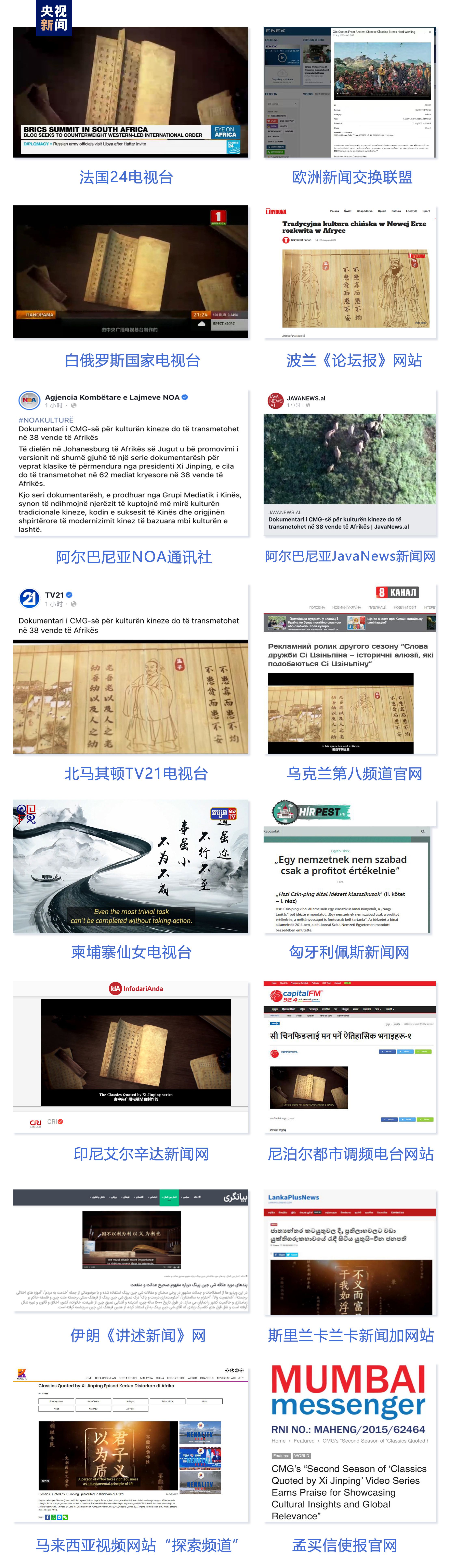 法國24電視臺、歐洲新聞交換聯(lián)盟、白俄羅斯國家電視臺、波蘭《論壇報》網(wǎng)站、阿爾巴尼亞NOA通訊社、北馬其頓TV21電視臺、烏克蘭第八頻道官網(wǎng)、匈牙利佩斯新聞網(wǎng)、柬埔寨東盟頭條新聞社、緬甸仰光傳媒、印尼艾爾辛達新聞網(wǎng)、尼泊爾都市調(diào)頻電臺網(wǎng)站等102家海外主流媒體紛紛轉(zhuǎn)播轉(zhuǎn)載《平“語”近人——習近平喜歡的典故》第二季多語種版本。