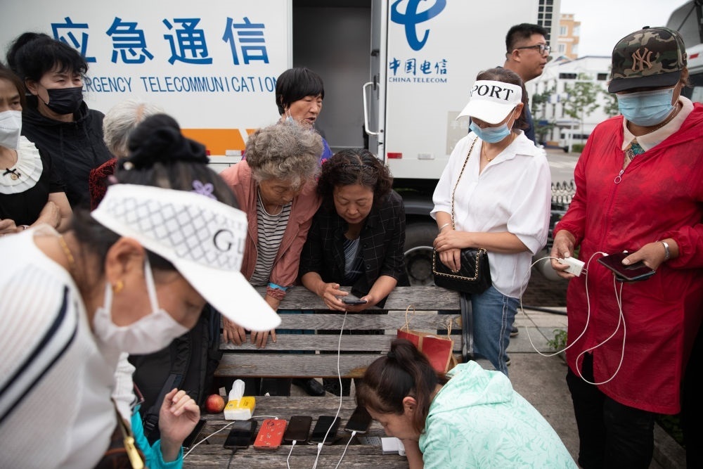 8月6日,群眾在黑龍江省海林市長(zhǎng)汀鎮(zhèn)一廣場(chǎng)上的應(yīng)急通信車(chē)前與外界通話。