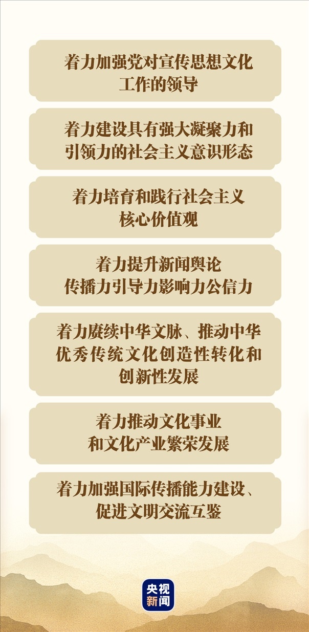 從2018年8月全國宣傳思想工作會議以“九個堅持”概括宣傳思想工作的規(guī)律性認識,到黨的二十大從五個方面重點部署文化建設(shè)工作,再到“七個著力”的重要要求……習(xí)近平總書記對于宣傳思想文化工作作出的一系列重要批示指示,既有認識論又有方法論,既有宏觀層面的整體指導(dǎo),又有具體層面的實踐路徑。