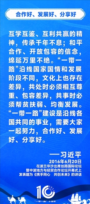 10年前,習(xí)近平主席提出共建“絲綢之路經(jīng)濟(jì)帶”和“21世紀(jì)海上絲綢之路”,即共建“一帶一路”倡議。過去10年來,習(xí)近平主席在多個場合發(fā)表講話和署名文章,為世界描繪了共建“一帶一路”互聯(lián)互通、合作共贏的宏偉藍(lán)圖。