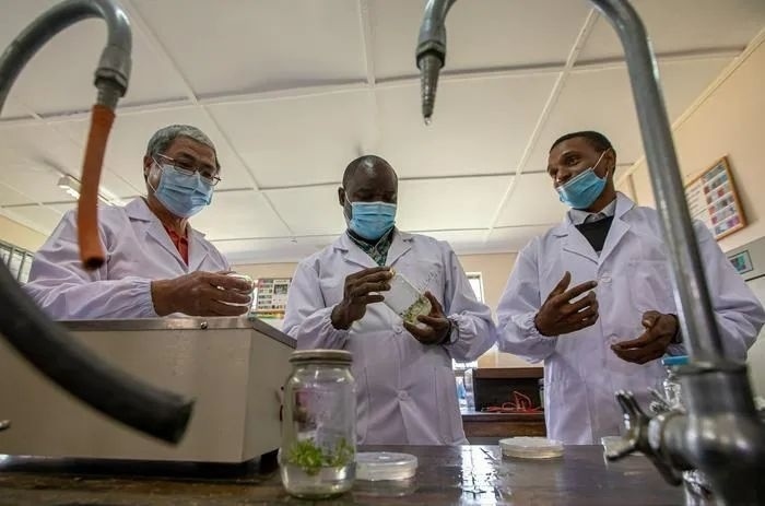 △2021年6月25日,肯尼亞,來(lái)自中國(guó)的農(nóng)學(xué)教授與肯尼亞農(nóng)業(yè)專家、肯方研究生在實(shí)驗(yàn)室內(nèi)交流實(shí)驗(yàn)成果。