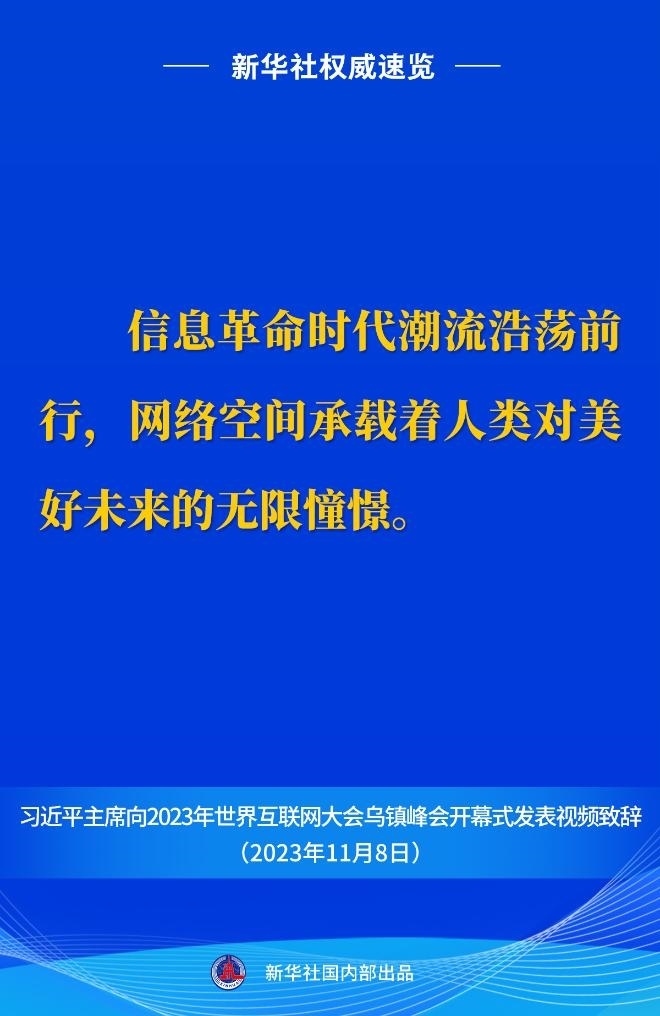 11月8日上午,國(guó)家主席習(xí)近平向2023年世界互聯(lián)網(wǎng)大會(huì)烏鎮(zhèn)峰會(huì)開(kāi)幕式發(fā)表視頻致辭。一起來(lái)看金句。