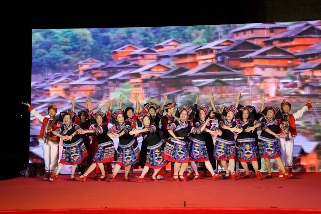 △2023年9月30日,廣西南寧市蟠龍社區(qū)舉辦的國慶節(jié)晚會,居民們在表演民族舞蹈。