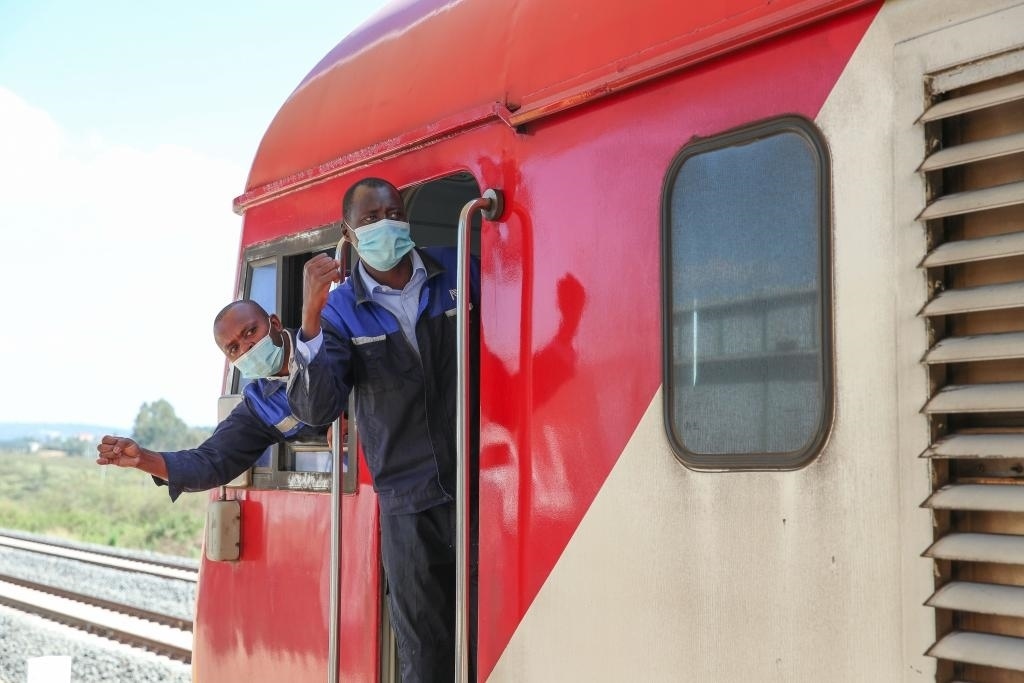 2022年3月25日,在肯尼亞內(nèi)羅畢,蒙內(nèi)鐵路肯方機(jī)車獨(dú)立班組成員與站臺(tái)工作人員確認(rèn)安全。