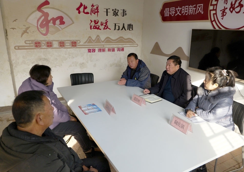 在寶豐縣鬧店鎮(zhèn)范營村“擺理堂”,村鎮(zhèn)干部(右)為村民進行信訪調(diào)解(2023年12月20日攝)。河南省寶豐縣積極推進四下基層工作深入開展,已打造鬧店鎮(zhèn)范營村“擺理堂”、石橋鎮(zhèn)東大莊村“老娘舅茶室”等系列鄉(xiāng)村社區(qū)服務(wù)陣地,協(xié)調(diào)鄰里關(guān)系,有效化解各類矛盾,同時不斷豐富工作內(nèi)容,拓展服務(wù)功能,助力鄉(xiāng)村振興。新華社記者 李嘉南 攝