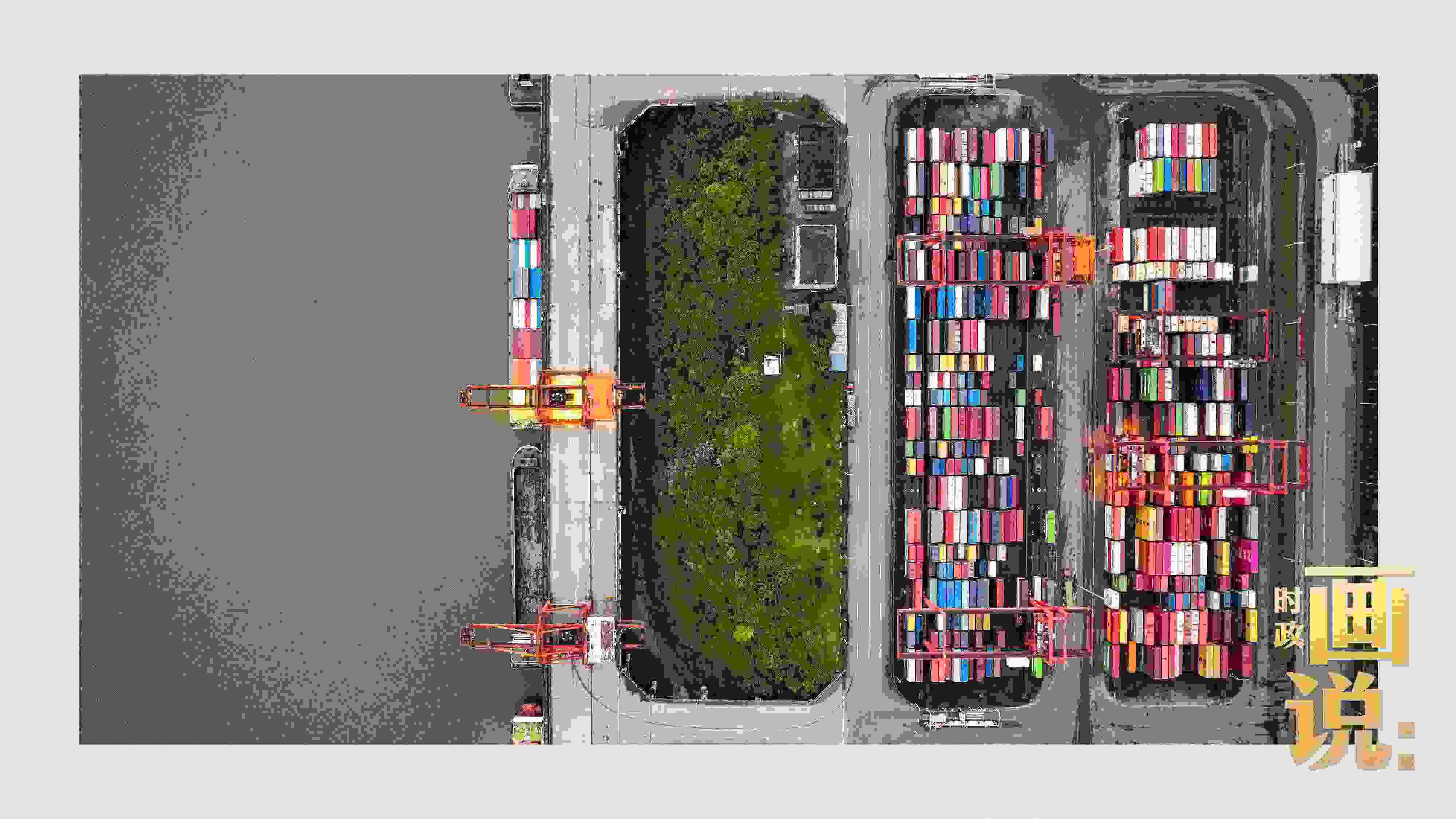 △果園港沿江碼頭平臺上,大型岸橋正在向滾裝輪上裝載貨柜。兩江新區(qū),重慶。